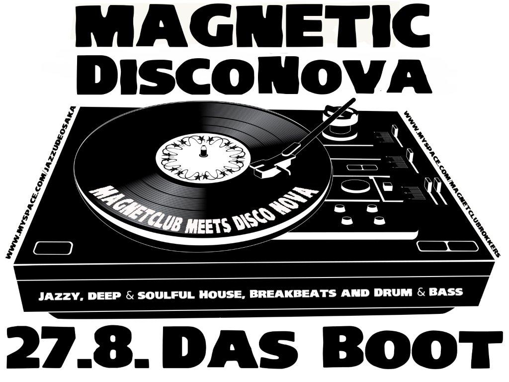 Seit nunmehr über 4 Jahren machen die Vinyl-Enthusiasten von Disco Nova (Jazzu de Osaka) und den Magnet Club Rokkers nahezu jedes Wochenende die Nacht zum Tag. Nach jahrelanger Co-Existenz im Keller des Pleicher Hof’s haben sich die beiden Veranstalter nun für eine Symbiose ihrer erfolgreichen elektronischen Parties entschieden. Stapellauf der Magnetic Disco Nova zu neuen elektronischen Welten findet am Freitag, 27. August auf dem würzburger Boot statt. Die musikalischen Sphären erstrecken sich von Deep House und jazzigen Grooves über Breakbeats bis hin zu Drum&Bass. Mit ihrer elektronischen Soundtapete verwandeln sie jede Tanzfläche in ein Fitnessstudio für Bauch, Beine und Po!